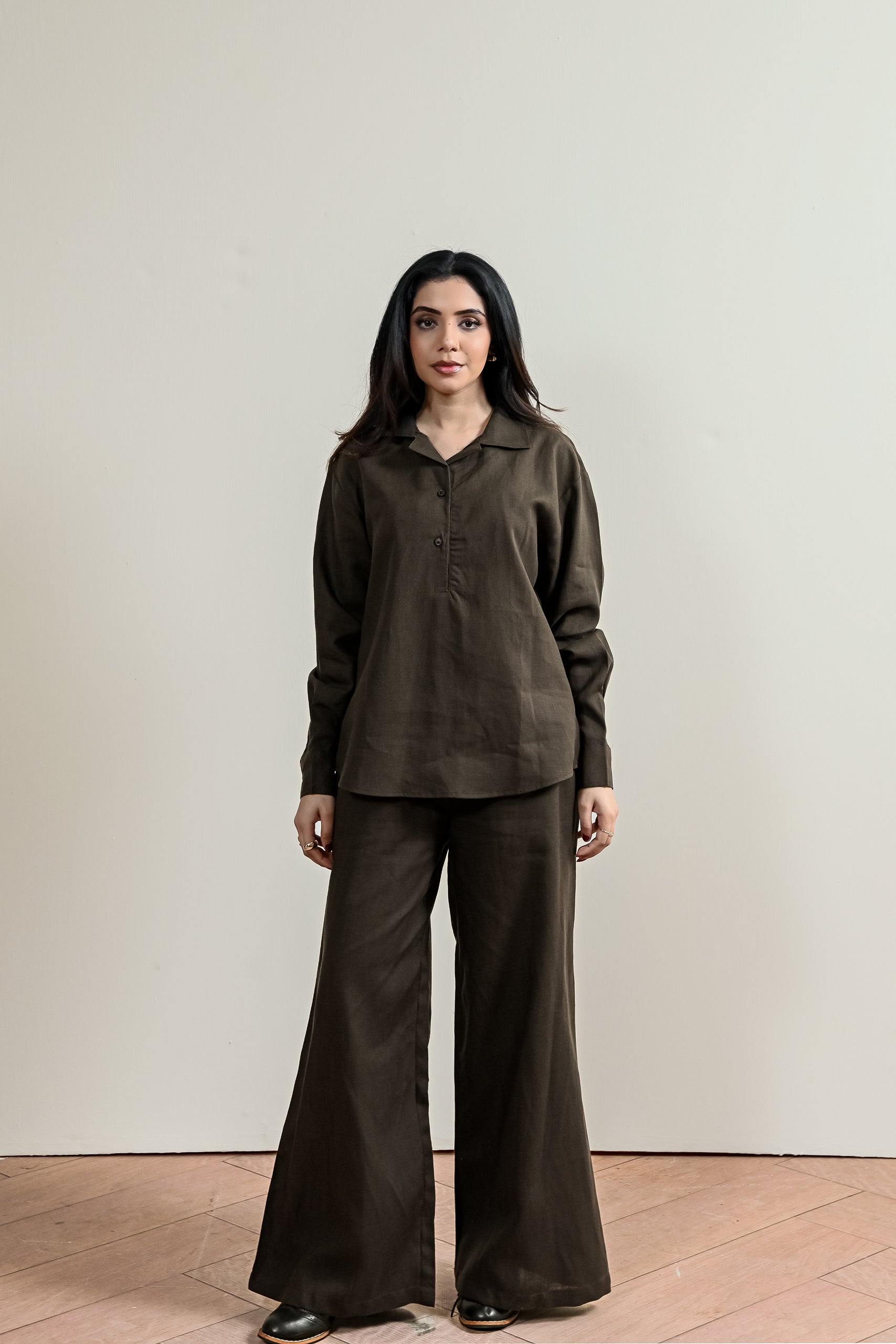 A refined pullover top crafted from breathable linen, designed with a soft split neckline and a clean half-placket front for an understated, modern look. The relaxed silhouette falls naturally through the body, creating an easy drape that feels light and effortless. Minimal detailing and a smooth front finish allow the fabric and shape to take focus, delivering a quietly elevated everyday style.