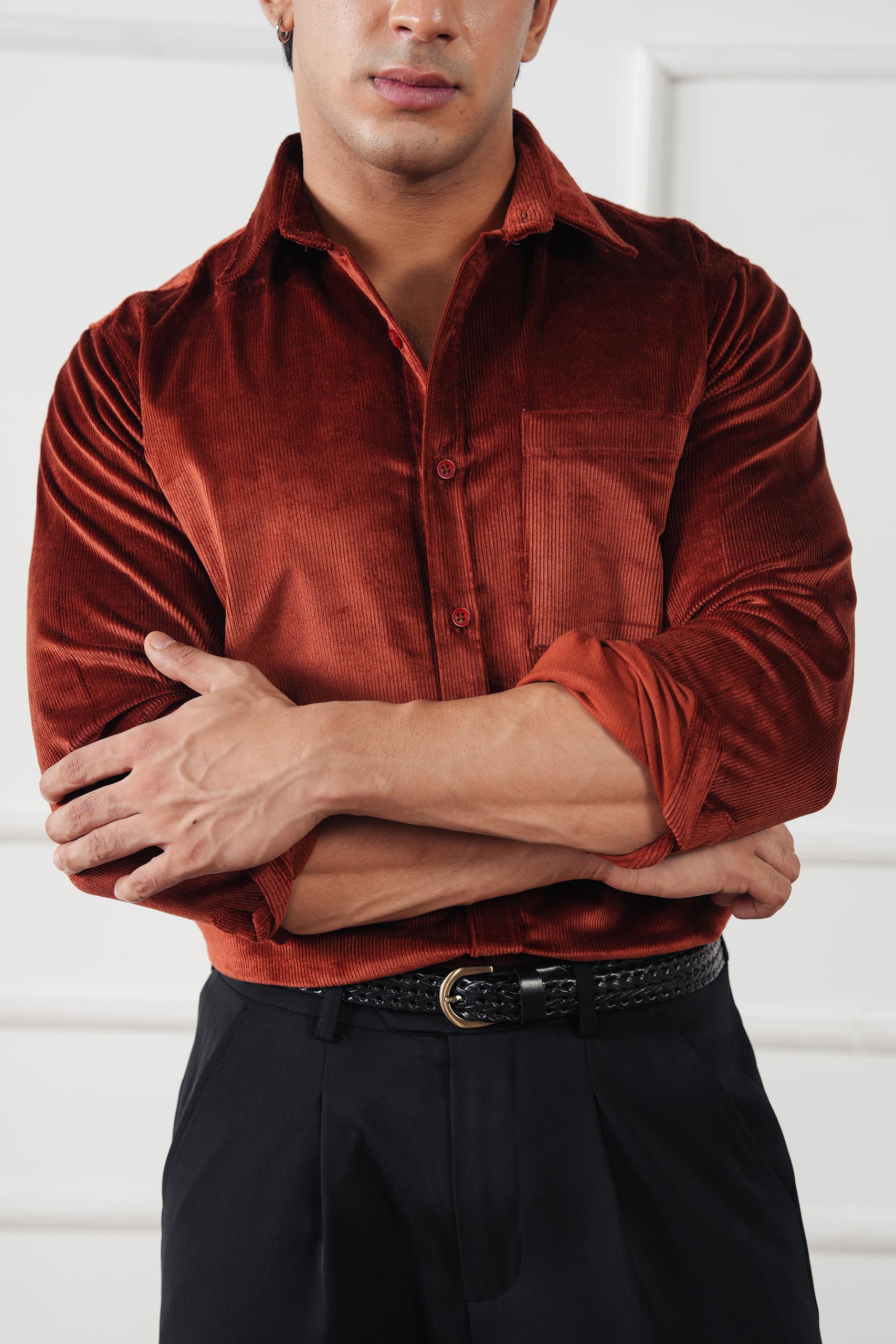 A plush, fine-wale corduroy overshirt with an effortless drape—designed to layer over knits or tees and polished enough to button up on its own. Quietly luxe, comfortably warm, and made for fall–winter ease.