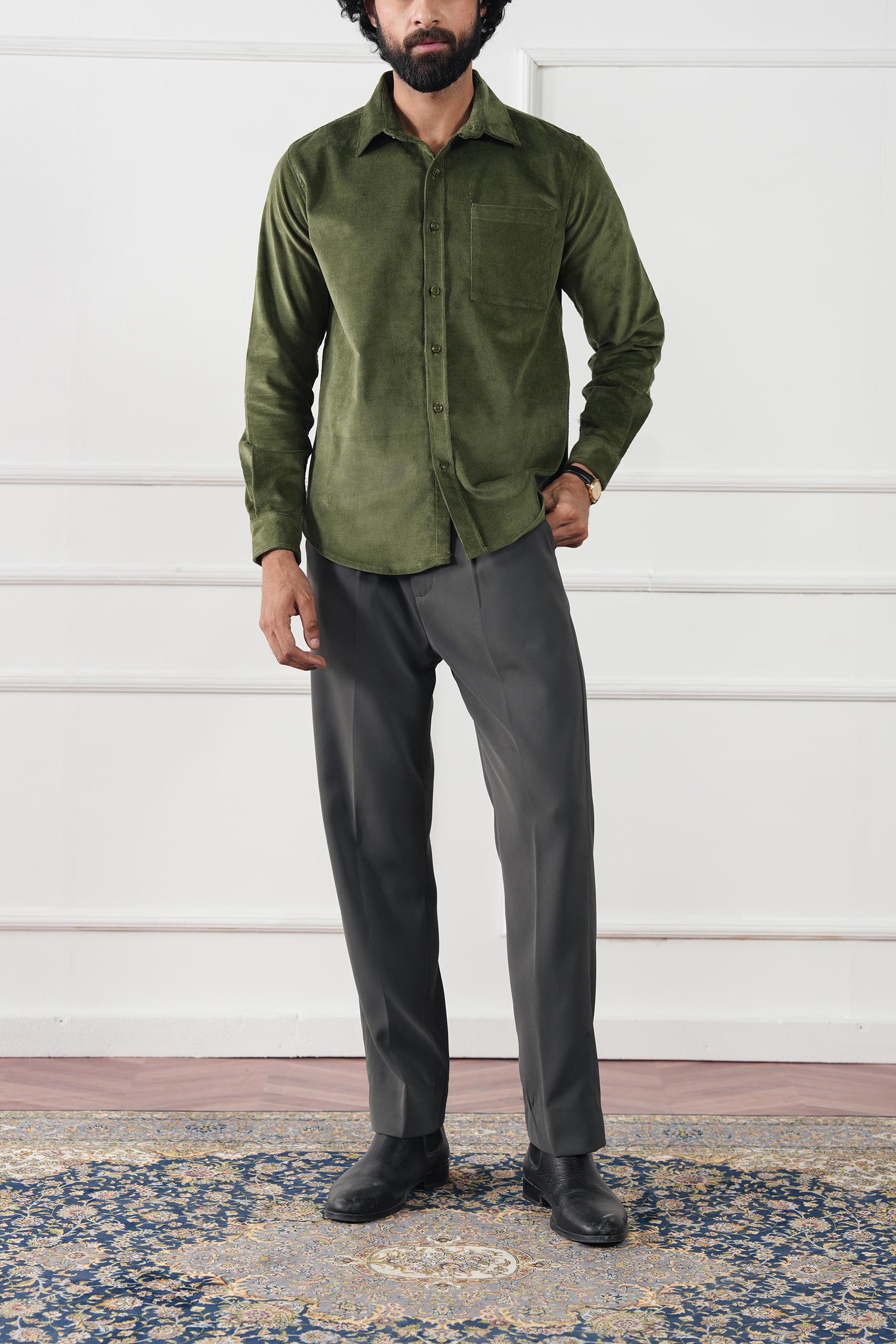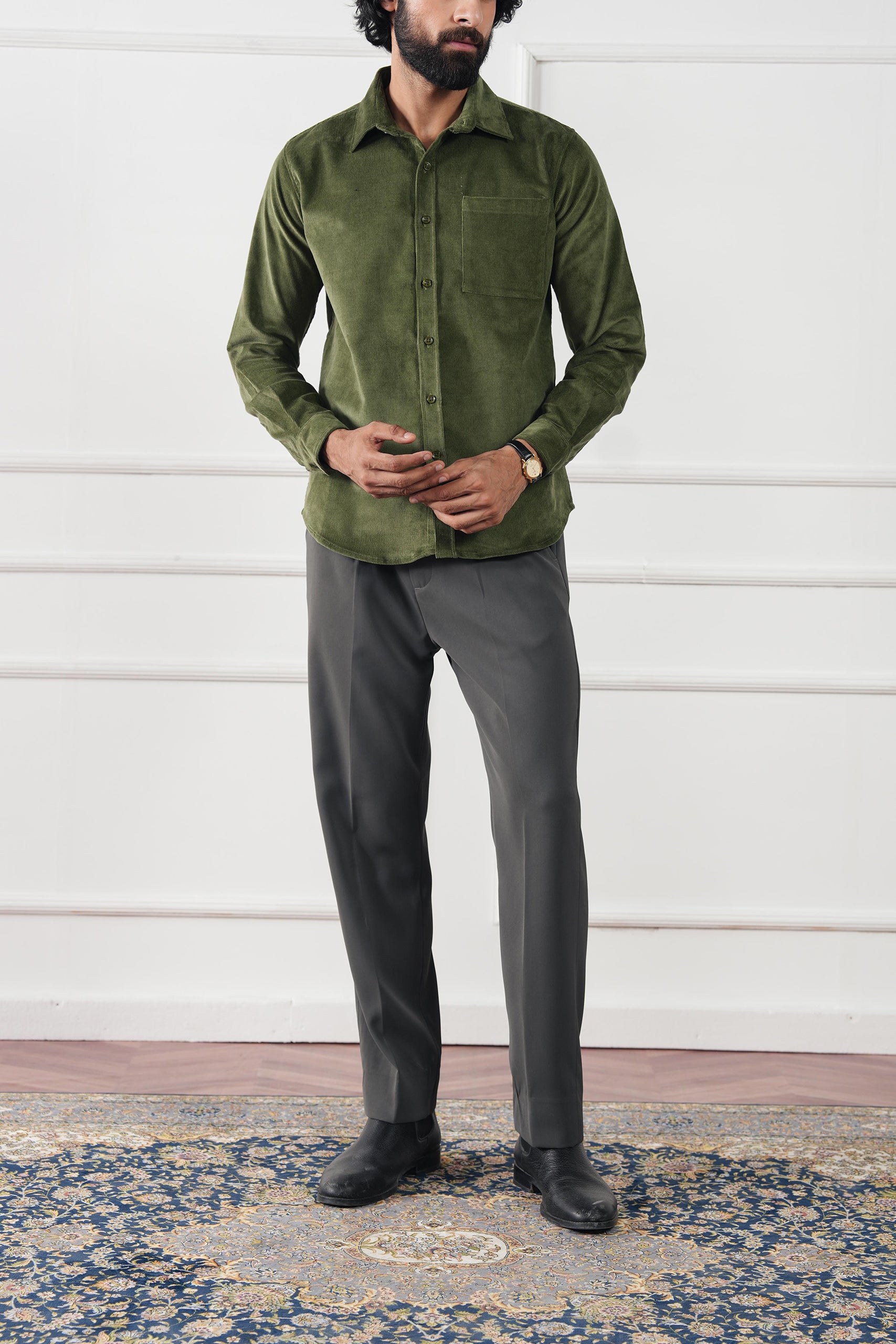A plush, fine-wale corduroy overshirt with an effortless drape—designed to layer over knits or tees and polished enough to button up on its own. Quietly luxe, comfortably warm, and made for fall–winter ease.