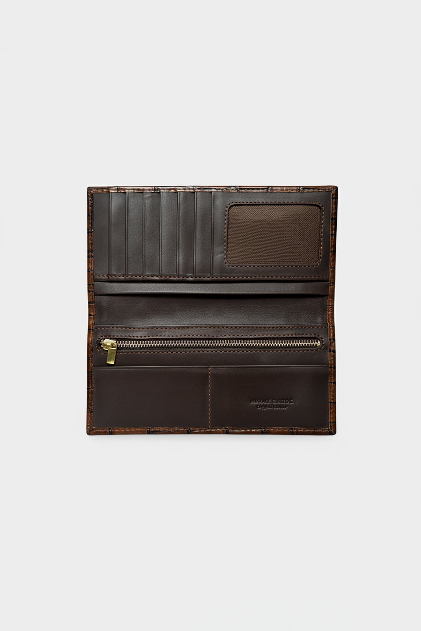 A refined long wallet crafted in full-grain aniline leather with a croc-textured top. Designed to slip neatly into the inside pocket of a blazer or overcoat, it opens to a silk-lined interior with thoughtful compartments and a secure brass-zip pocket—quiet luxury for life on the move.