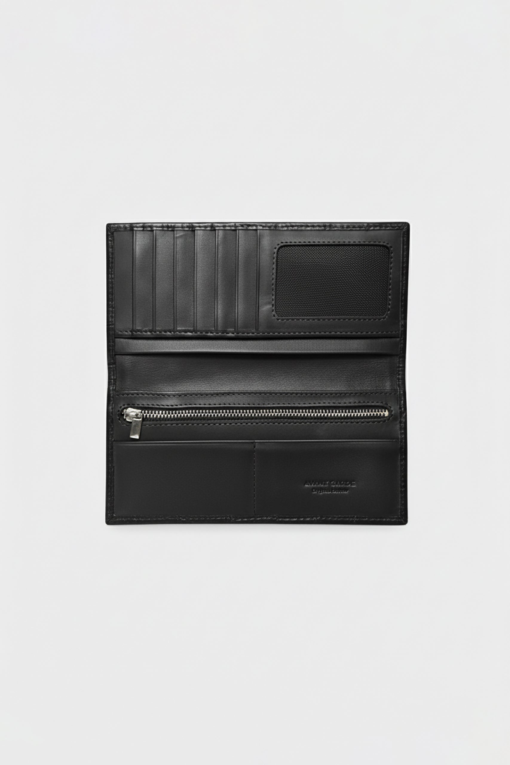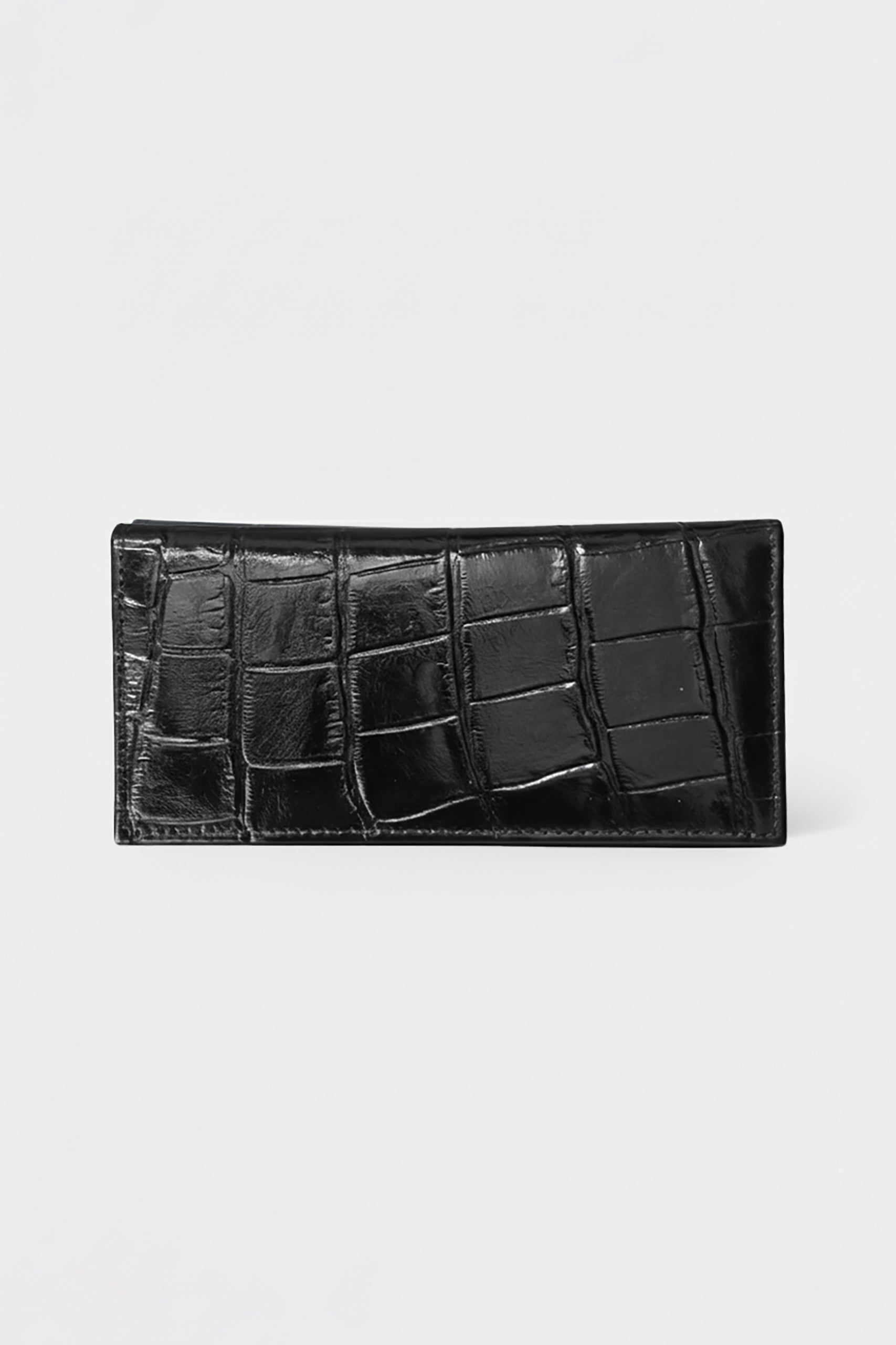 A refined long wallet crafted in full-grain aniline leather with a croc-textured top. Designed to slip neatly into the inside pocket of a blazer or overcoat, it opens to a silk-lined interior with thoughtful compartments and a secure brass-zip pocket—quiet luxury for life on the move.
