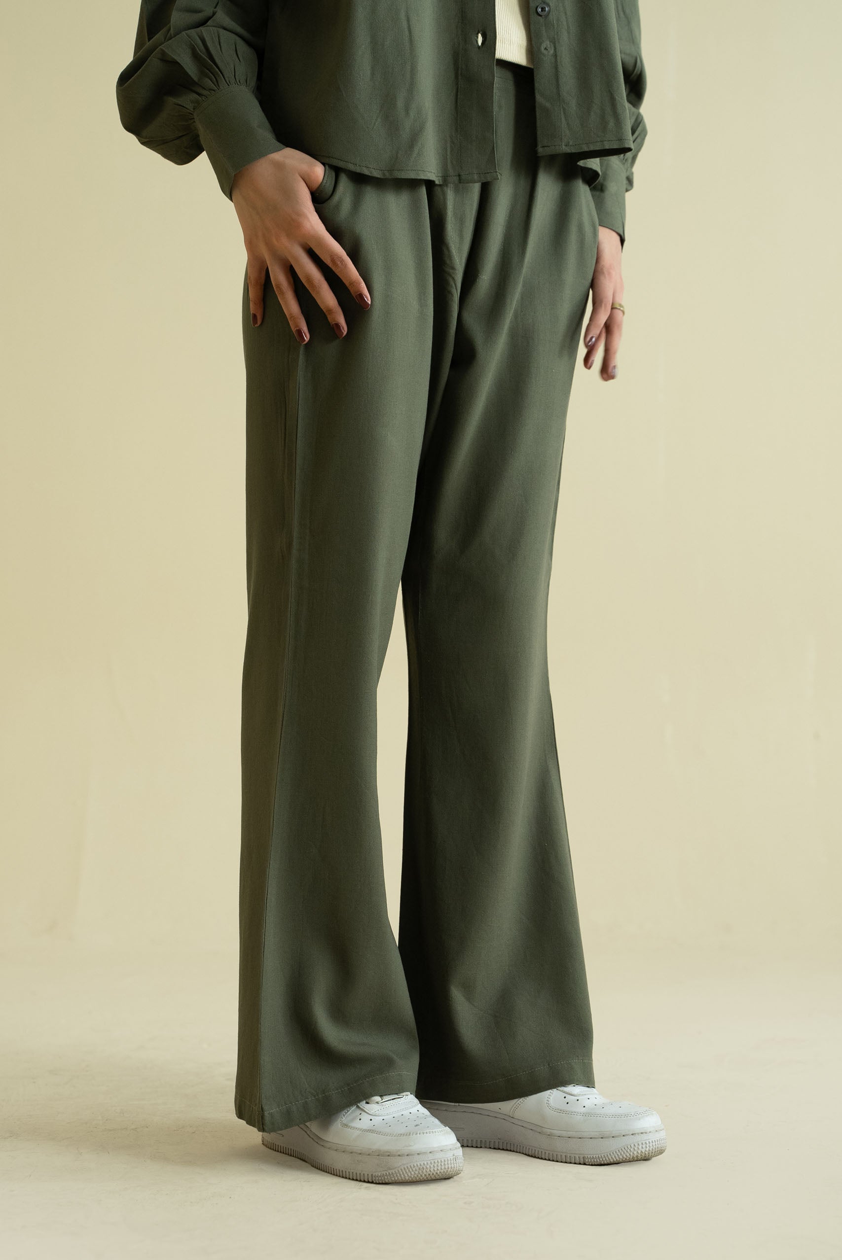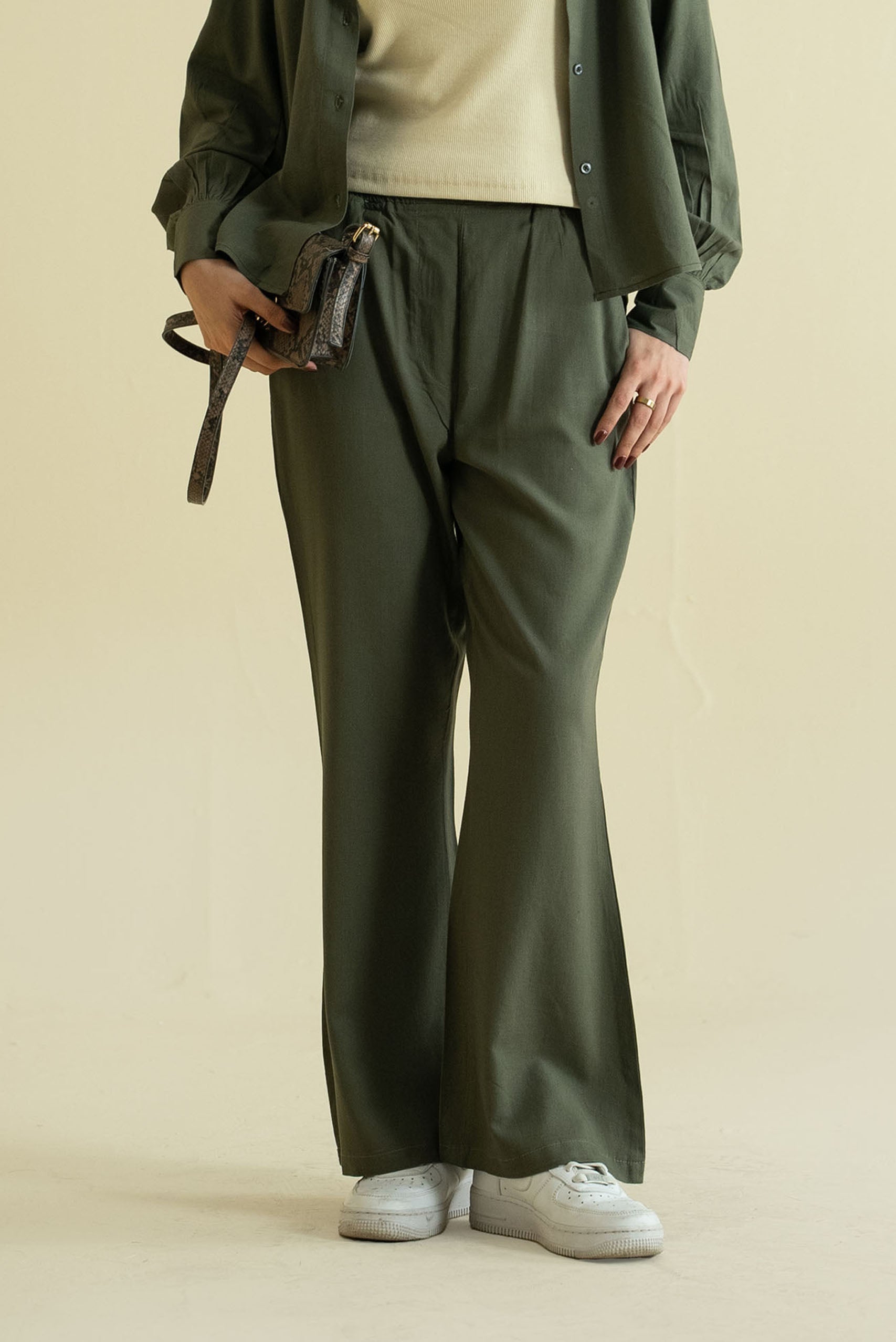 - Flared pants with elasticated waist