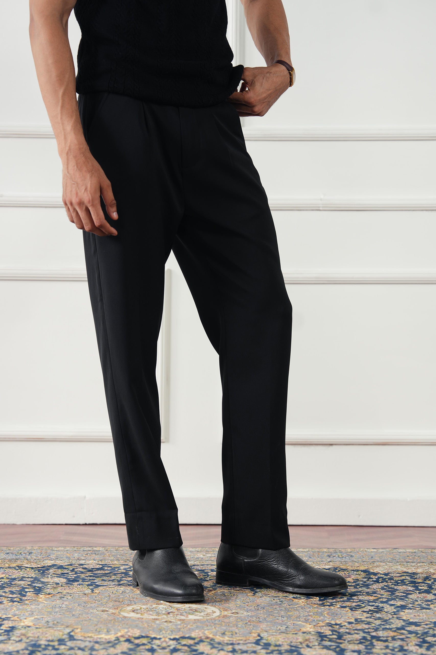 - Front pleats for a refined tailored silhouette