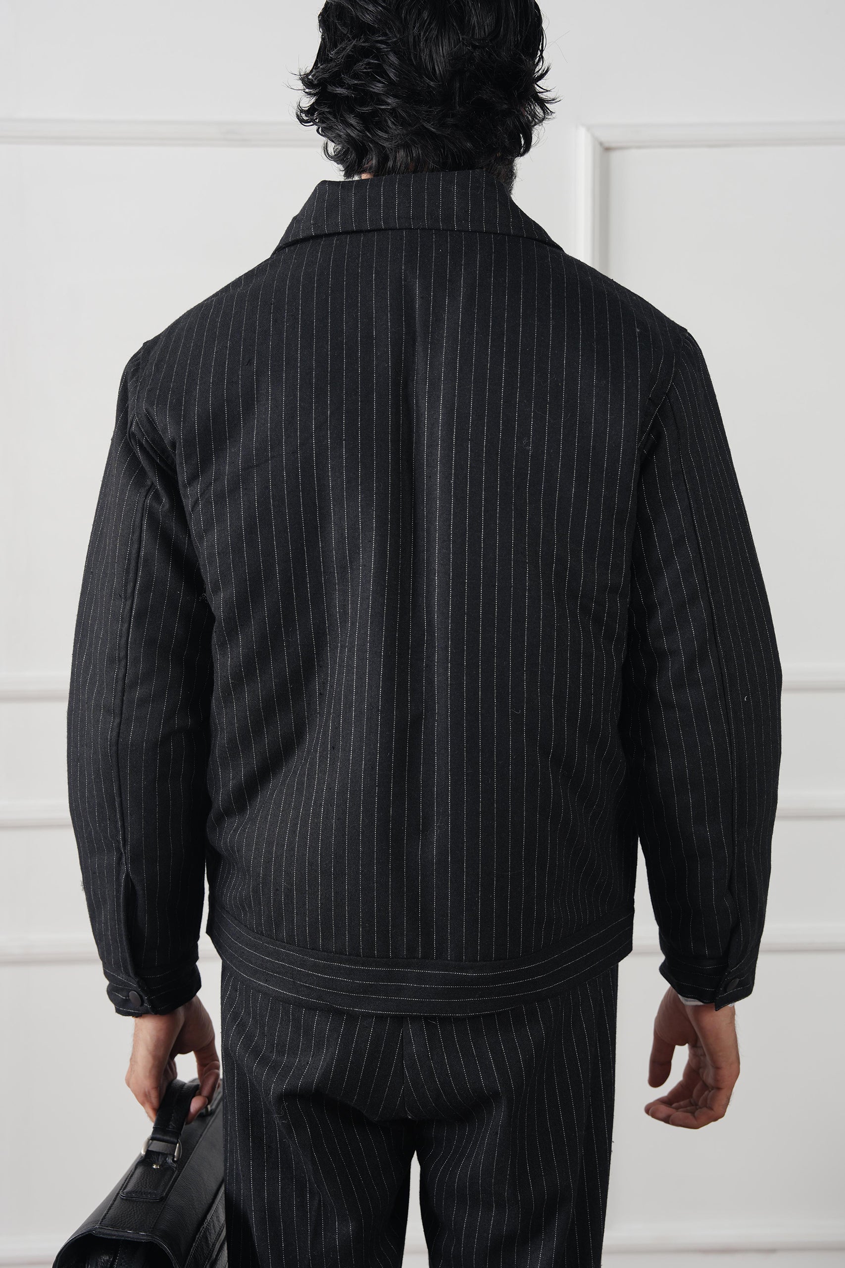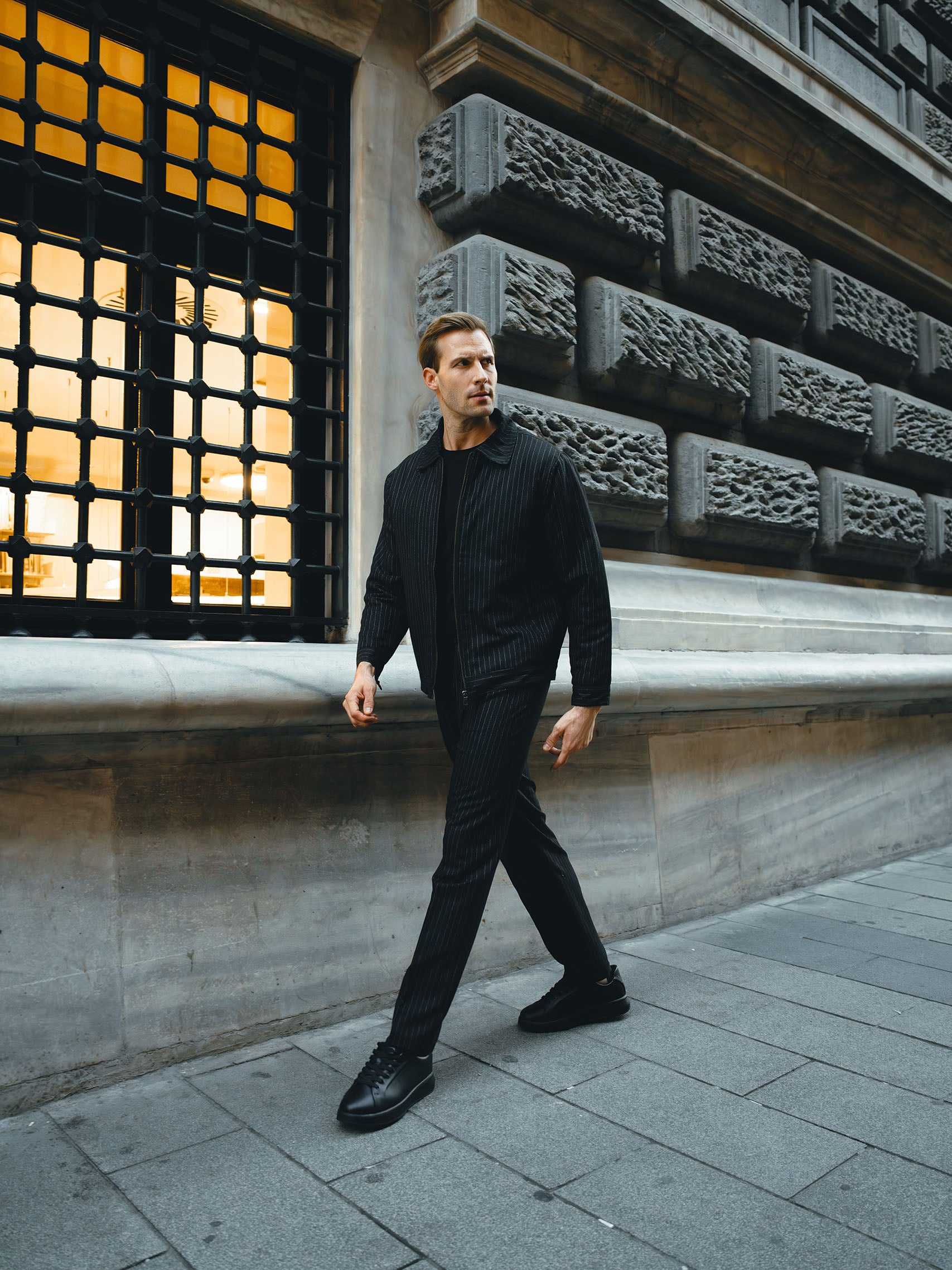 Refined tailoring meets casual sophistication in the Pinstripe Wool Jacket — a modern layer that balances ease and structure. Designed for fall and winter, it features subtle vertical stripes that elongate the frame, a clean zip-front closure, and a softly tailored fit that moves effortlessly between work and leisure.