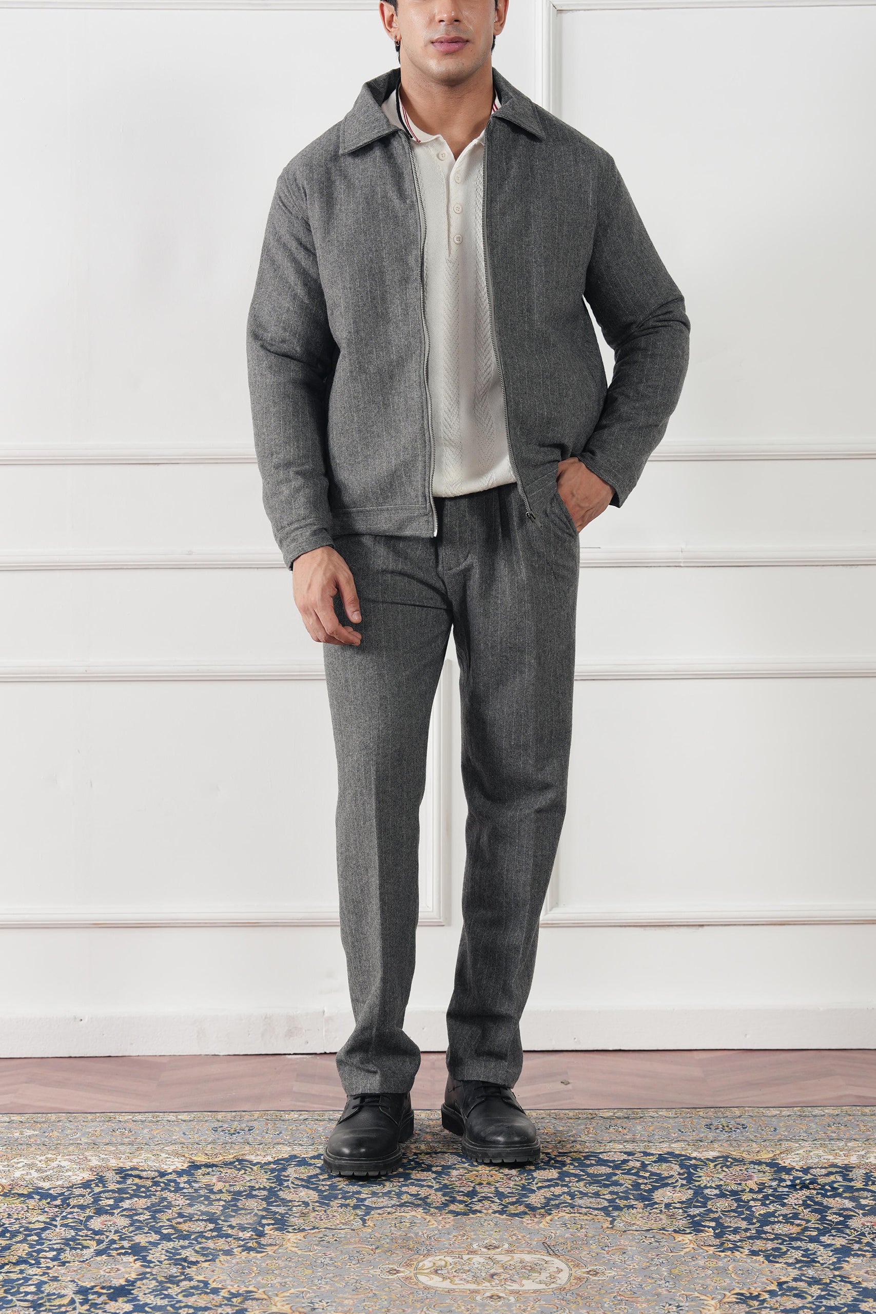 Refined tailoring meets casual sophistication in the Pinstripe Wool Jacket — a modern layer that balances ease and structure. Designed for fall and winter, it features subtle vertical stripes that elongate the frame, a clean zip-front closure, and a softly tailored fit that moves effortlessly between work and leisure.