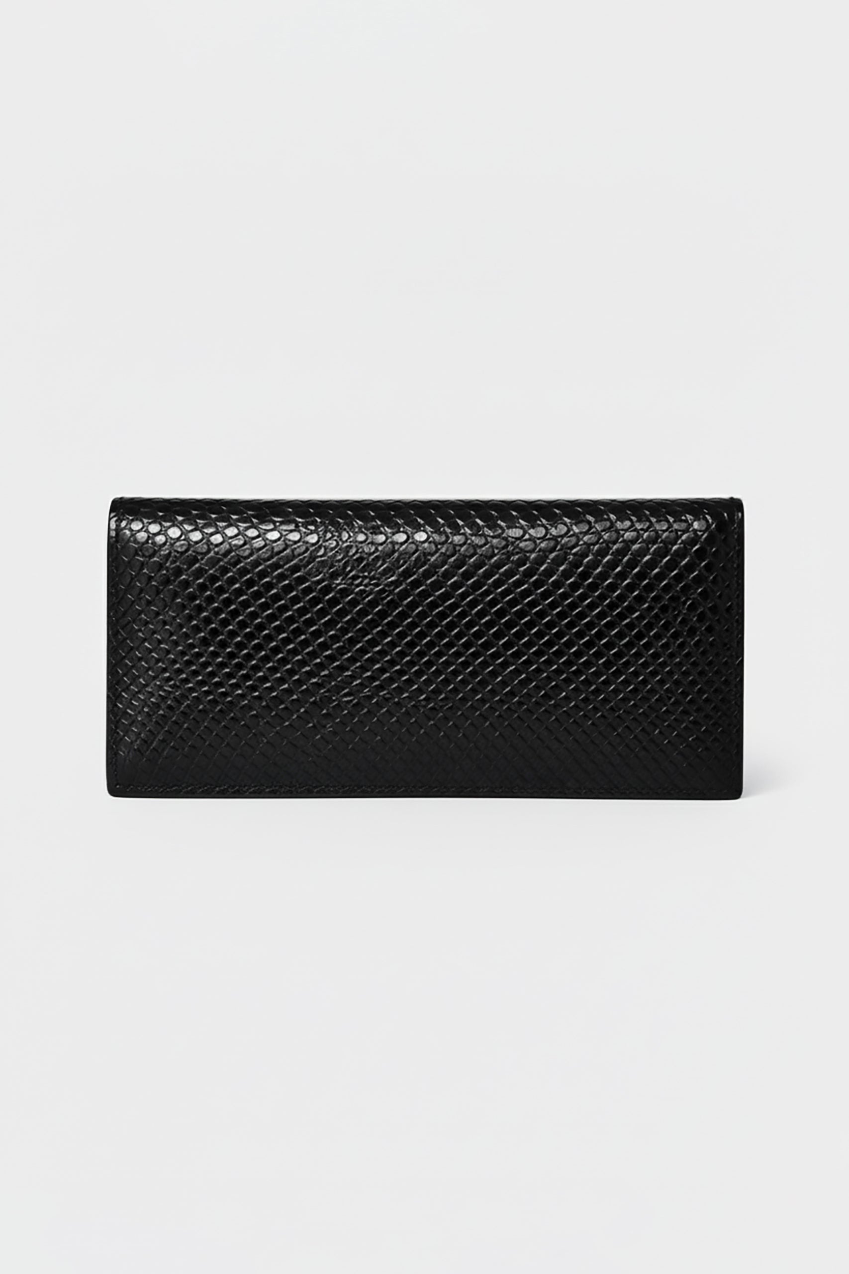 A refined long wallet crafted in full-grain aniline leather with a snake-textured top. Designed to slip neatly into the inside pocket of a blazer or overcoat, it opens to a silk-lined interior with thoughtful compartments and a secure brass-zip pocket—quiet luxury for life on the move.