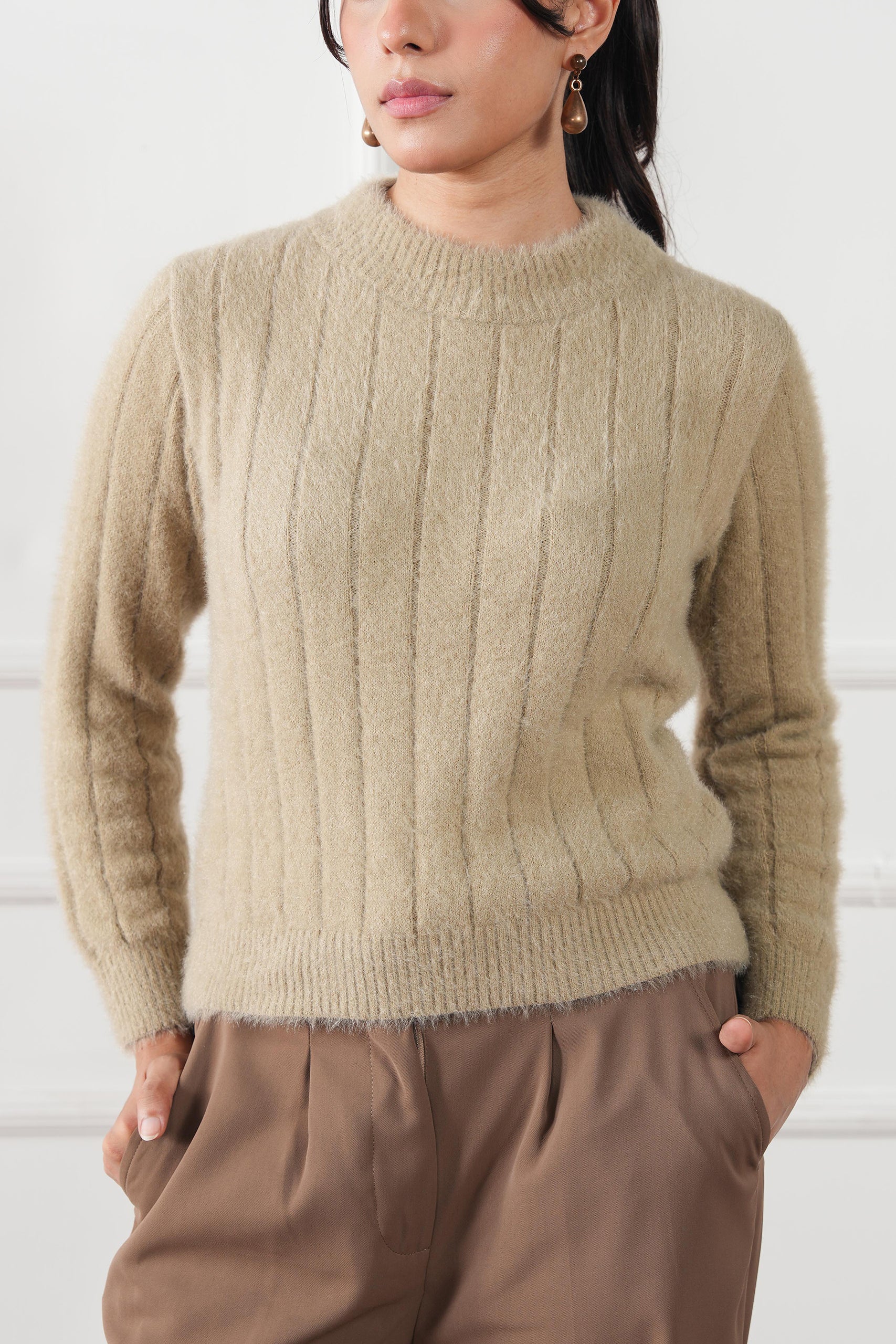 A timeless piece of quiet luxury, the Round Neck Knit Sweater is crafted with a feather yarn knit technique that lends a soft, plush hand feel and refined texture. Designed for effortless sophistication, it brings warmth and elegance to cool-weather dressing — a perfect balance of comfort and style.