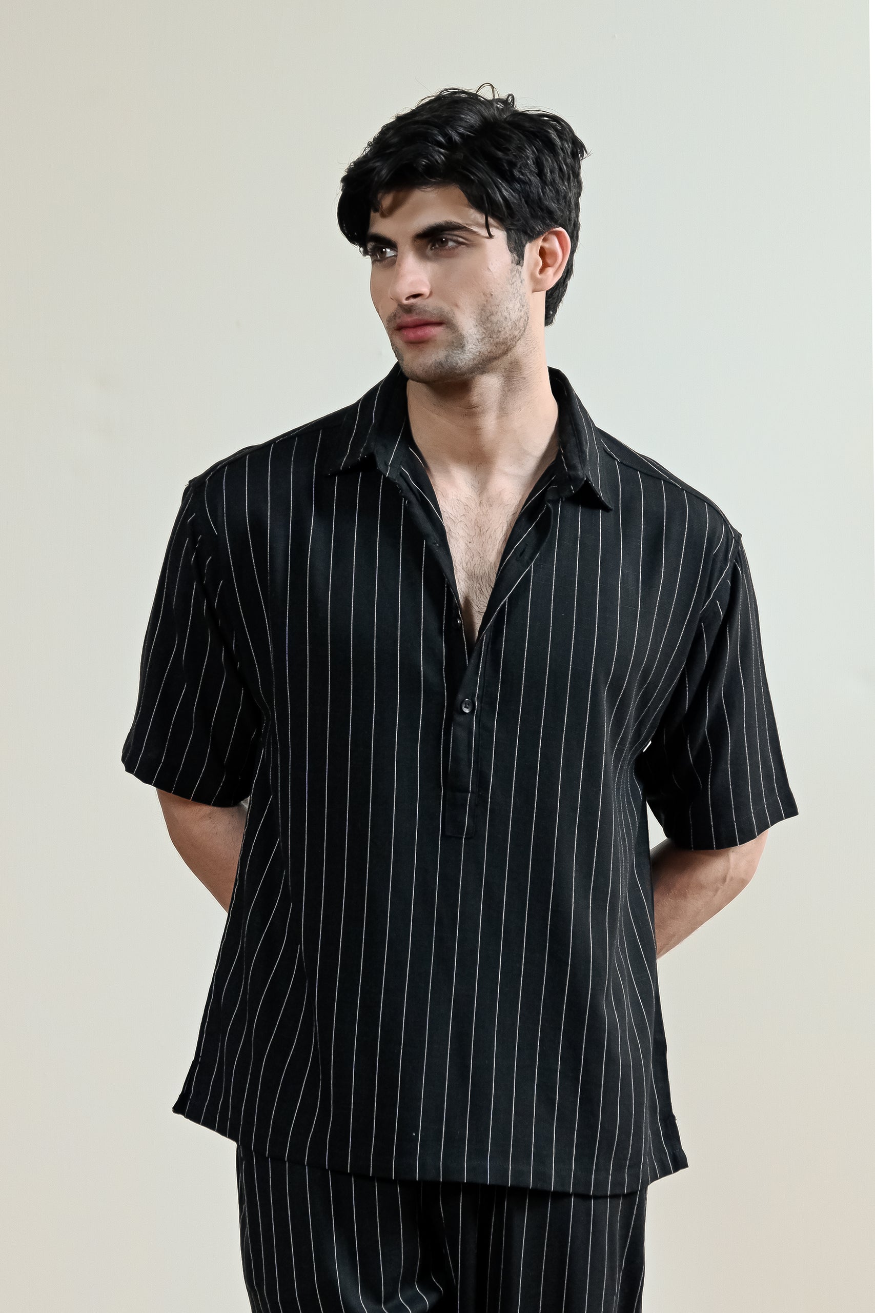 Designed with a clean polo-inspired neckline, this linen shirt delivers a refined everyday look with a relaxed summer feel. Crafted from breathable linen, the fine vertical pinstripes add subtle structure, while the polo-style collar and half-button placket create a sharp, modern front profile. Finished with short sleeves and an easy, natural drape.